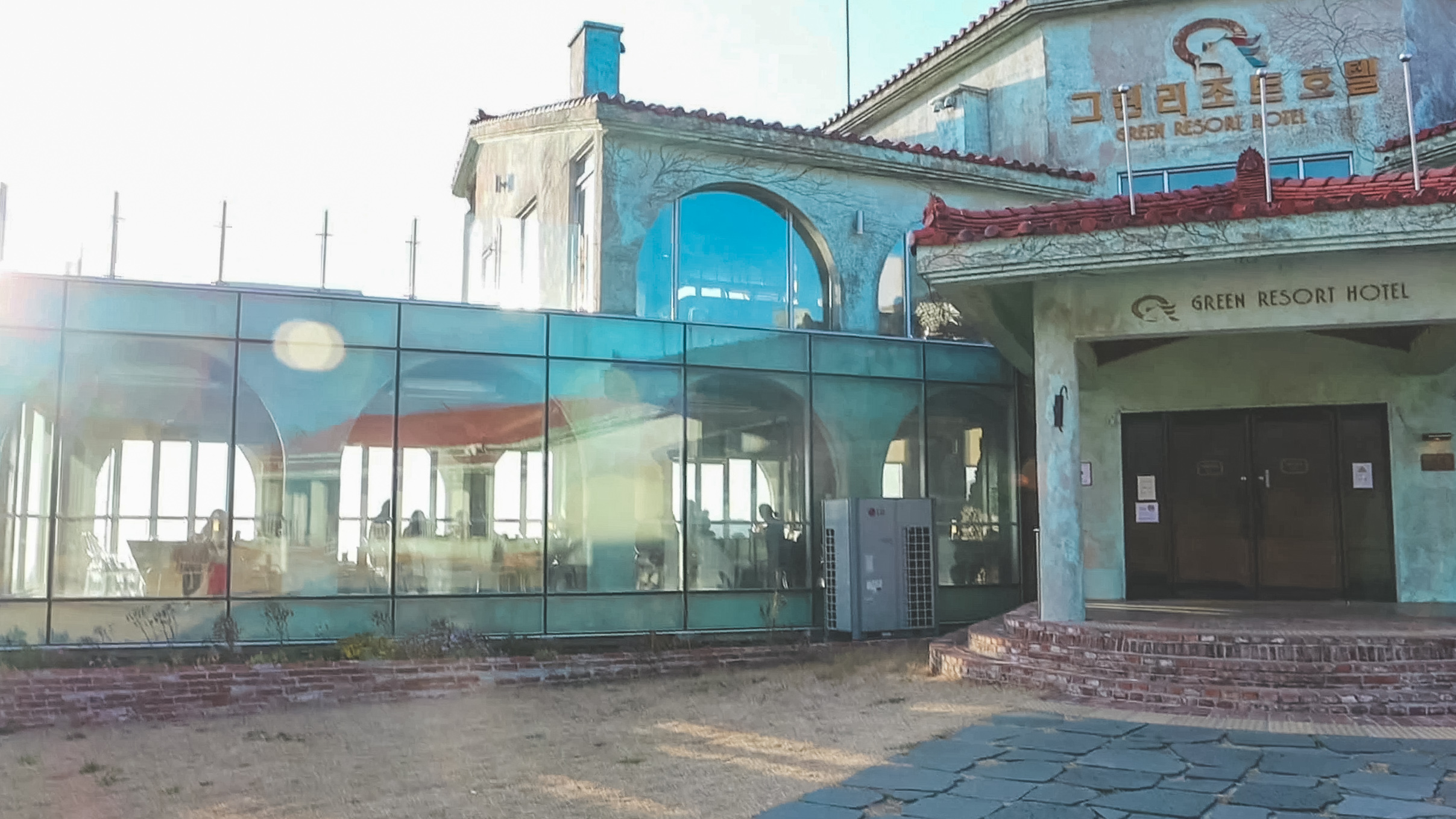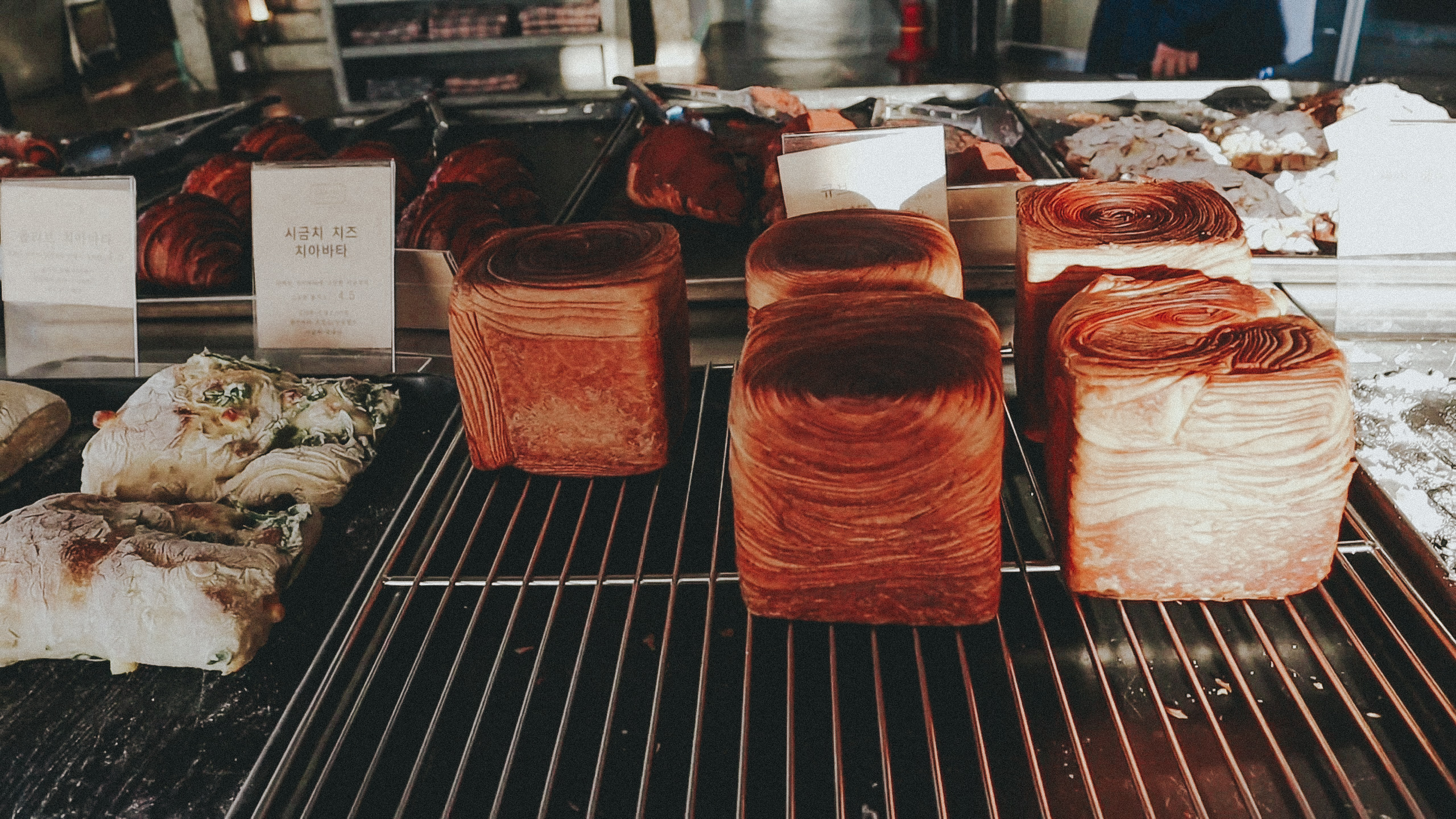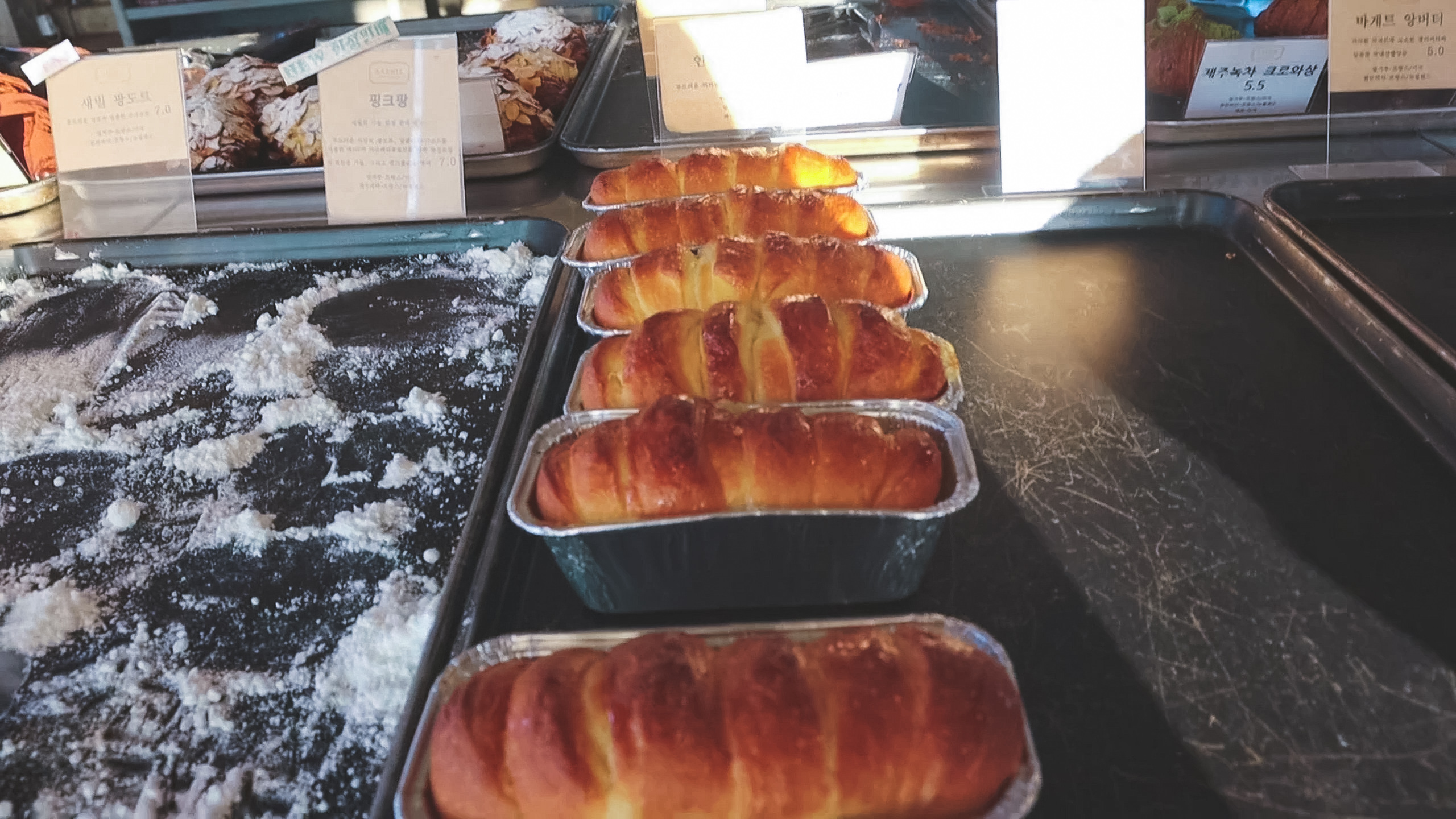 새별오름에서 저-멀리 보이던 건물. 그린 리조트 호텔이라는 아주 예스러운 건물. 죽어있는 리조트를 인수해서 리모델링하였는데 외관은 그대로 두어 빈티지한 분위기가 물씬 풍긴다. 새별 오름 근처에 있는 카페인만큼 큰 창으로 새별 오름도 볼 수 있고 특히 노을 지는 시간에는 한껏 낭만적인 뷰가 펼쳐진다. 외관의 독특함 때문에 와보고 싶었던 카페, 커다란 문을 열고 들어서자마자 많은 빵들이 반겨준다.
