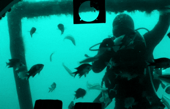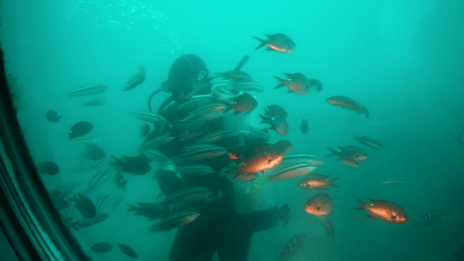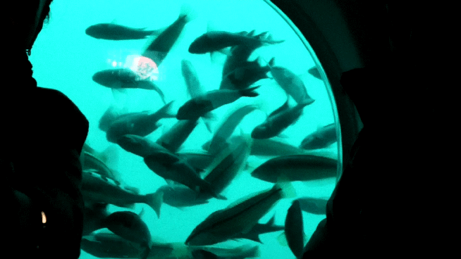 어느정도 내려가면 잠수부님이 먹이로 물고기를 유인해주신다. 먹이 냄새를 맡고 쫄쫄 따라다니는 물고기들이 왜이렇게 귀엽게 느꺼지던지. 창마다 찾아와주시는데, 그 때 셀카를 찍으라고 타이밍도 친절하게 알려주신다. 우리도 열심히 타이밍을 맞춰 셀카를 찍긴 했는데...셀고 둘이서 어두운 곳에서 사진을 찍는다는 건 너무 어려운 일이였다.